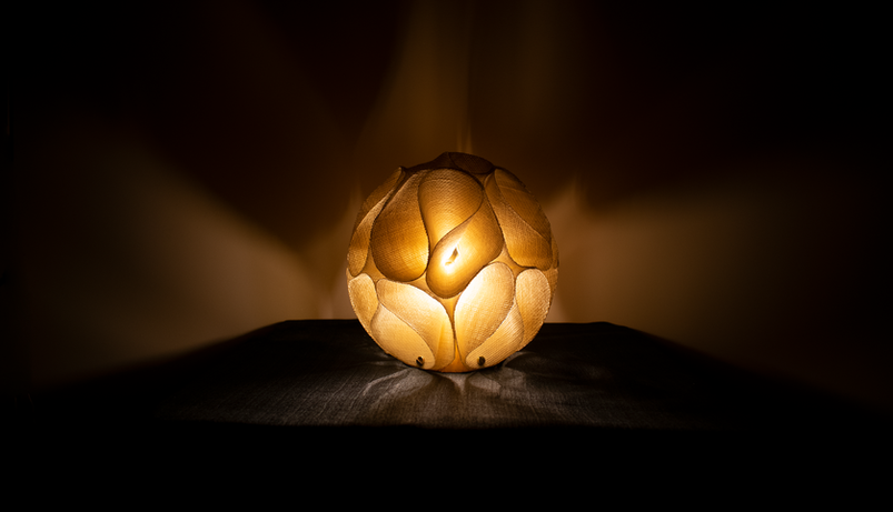 An accent light inspired by the cultivated form of the soft, white, and translucent mushroom — known for growing into near-perfect spheres. Light gently filters through the open weave of jute, casting delicate, petal-like patterns onto the wall. Versatile in its design, this piece can be used as a wall-mounted fixture, ceiling pendant, or table lamp, beautifully embodying the quiet elegance and organic essence of a mushroom.